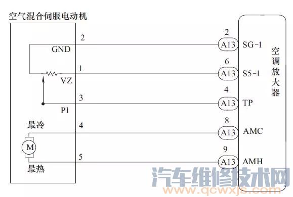 這里以豐田花冠車型的空氣混合伺服電動機為例,其線路圖如下圖 ▼