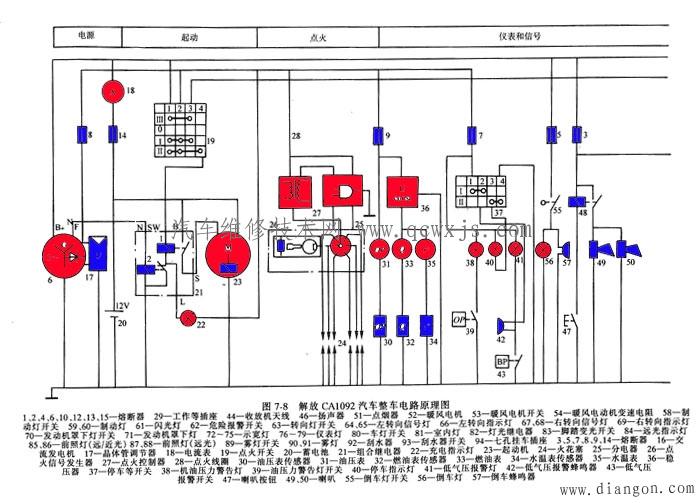 圖注說明了該汽車所有電氣設備的名稱及其數碼代號,通過讀圖注可以初步了解該汽車都裝配了哪些電氣設備。然后通過電氣設備的數碼代號在電路圖中找出該電氣設備,在進一步找出相互連線、控制關系。