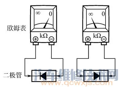 如果電路有二極管,應(yīng)對(duì)換兩根引線并再次檢查。將負(fù)極引線和二極管正極連接,正極引線和二極管負(fù)極連接時(shí)應(yīng)導(dǎo)通,將兩根引線對(duì)換時(shí)應(yīng)不導(dǎo)通(下圖)。