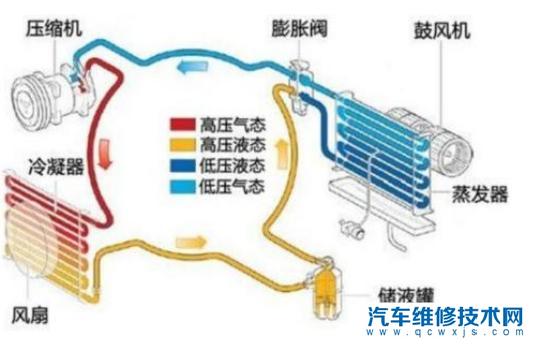 是用壓縮機壓縮氣態制冷劑,使制冷劑升溫放出熱量,經過冷疑器的散熱,制冷劑變成液態。冷疑器的名稱就是這么來的,經過散熱冷卻制冷劑從氣態疑結為液態。液態制冷劑經過儲液罐過濾再經澎漲閥節流后噴入蒸發器,吸收蒸發器上的熱量后,制冷劑又變成氣態,也就是液體蒸發變成氣體,同時帶走了蒸發器上的熱量,使蒸發器降溫。當鼓風機的風吹過蒸發器,出來的就是涼爽的空調風了。