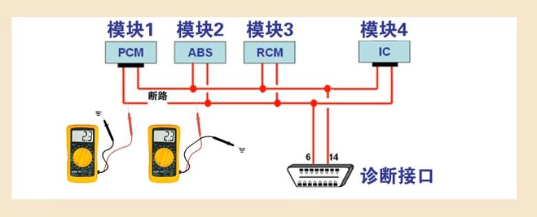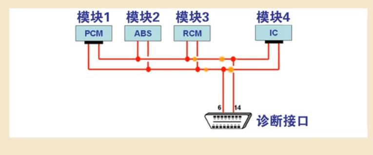 這是一張網絡結構圖,兩邊的模塊帶有終端電阻,其他模塊都連接到網絡,診斷接口也連接上網絡,正常情況下,從診斷接口處測量這兩根線電阻為60歐姆。