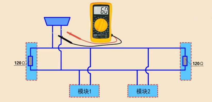 如果模塊之間線路斷了,這樣只能測量到一個電阻,顯示為120歐姆。通過這種方法就能就檢測出斷路了。