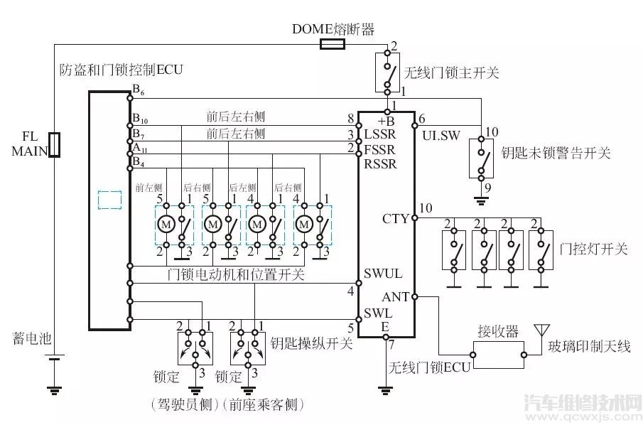 下圖為汽車遙控門鎖系統(tǒng)電路,主要由遙控門鎖主開關(guān)、遙控發(fā)射器、遙控門鎖ECU、玻璃印制天線(除霜電熱絲)、防盜和門鎖ECU、門控燈開關(guān),鑰匙未鎖警告開關(guān)、門鎖電動機和位置開關(guān)等組成,電路工作原理如下: