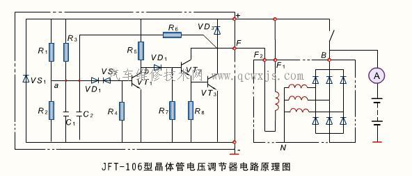 晶體管電壓調節器利用晶體管的開關作用,控制發電機勵磁電路的通、斷,調節勵磁電流和磁極磁通,在發電機轉速超過一定數值以后維持發電機電壓恒定。CA1091型汽車發電機上配用的晶體管電壓調節器電路原理 圖。