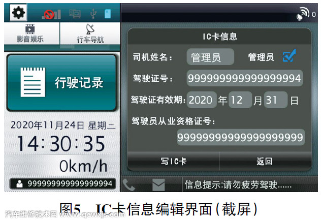 (4)點擊“IC卡信息”進(jìn)入IC卡信息編輯界面(圖5),輸入駕駛?cè)藛T屬性(駕駛員/管理員)、駕駛證號、駕駛證有效期、駕駛員從業(yè)資格證號等信息。