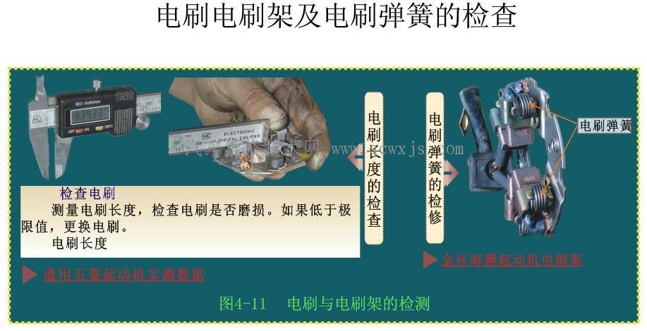 汽車每行駛 5 000 ~ 6 000 km 時,應檢查測試 電刷的磨損程度 以及電刷彈簧的壓力,均 應在規定范圍 之內;每年對起動機進行一次解體性保養。