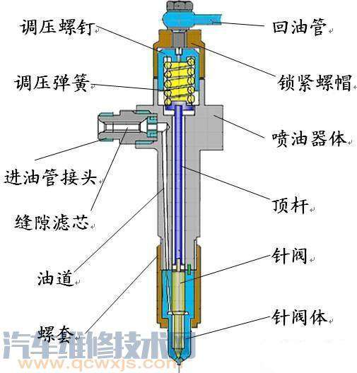 柴油發動機噴油嘴的工作是依靠油泵將柴油加壓后經太高壓油管,將高壓柴油擠入噴油嘴,然后才當油壓到了可以頂開調壓彈簧的壓力時,針閥向上運動,高壓柴油從噴油嘴底部的小孔中噴射而出,形成良好的霧狀小油珠便于壓燃。