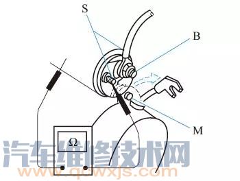 ② 用萬用表檢查接線端S與殼體(蓄電池負極)之間的導通性,正常應(yīng)該導通,如果不導通,則更換電磁開關(guān)。