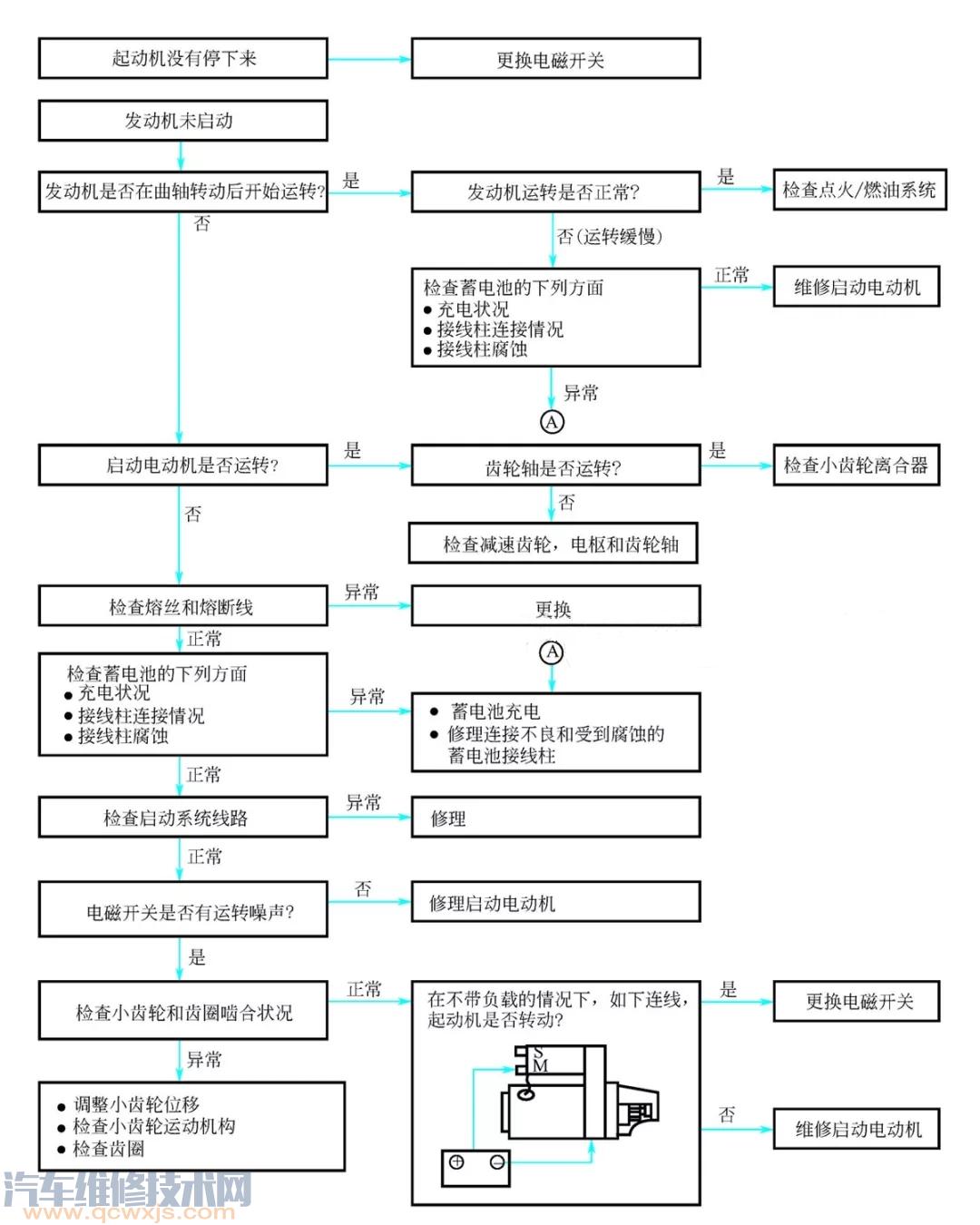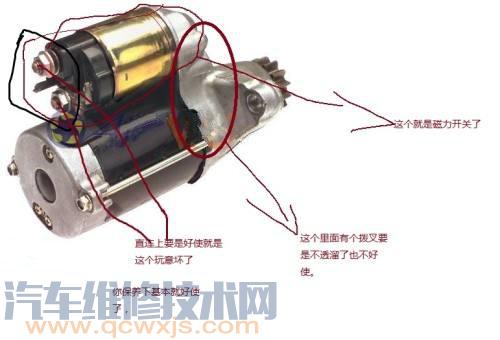 斷路、短路或搭鐵不良的情況時,會出現起動機的驅動齒輪周期性地敲擊飛輪的“噠、噠”聲。
