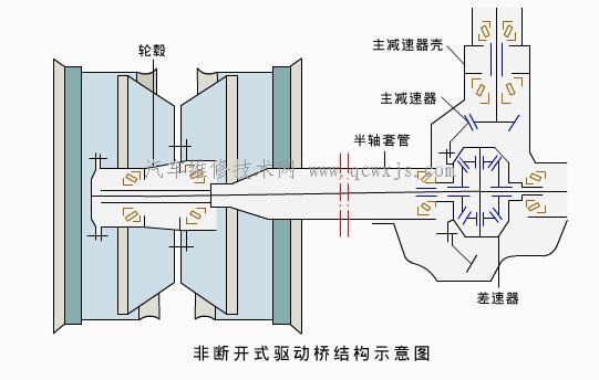 當(dāng)車輪采用非獨(dú)立懸架時(shí),驅(qū)動(dòng)橋采用非斷開式。其特點(diǎn)是半軸套管與主減速器殼剛性連成一體,整個(gè)驅(qū)動(dòng)橋通過彈性懸架與車架相連,兩側(cè)車輪和半軸不能在橫向平面內(nèi)做相對(duì)運(yùn)動(dòng)。非斷開式驅(qū)動(dòng)橋也稱整體式驅(qū)動(dòng)橋。