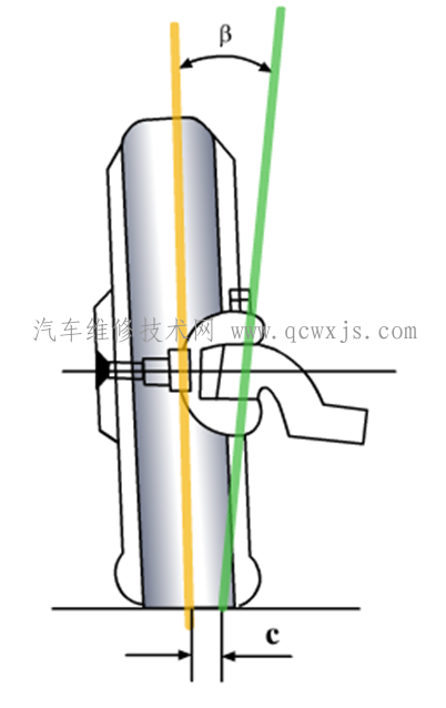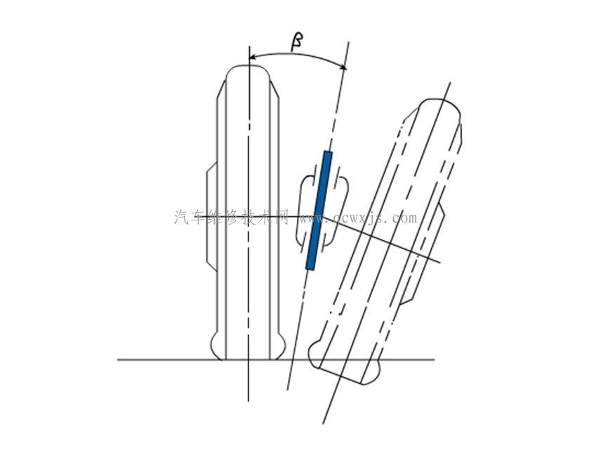主銷內傾角β定義: 轉向節主銷軸線或假想的主銷軸線在橫向平面內向內傾斜,與鉛垂線所形成的夾角稱為主銷內傾角。