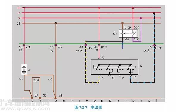 (3)卸荷線卸荷線(X)是大容量火線,霧燈、刮水器和風窗加熱等用電取自X線,只有在點火開關位于“ON”擋時X觸點繼電器J59才工作,30號線經X觸點繼電器接通X線,而在點火開關位于“ST”(啟動)擋啟動發動機時X線自動斷電,從而保證發動機能順利啟動。