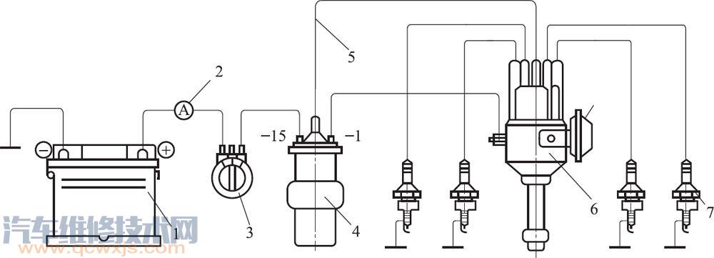 1—蓄電池;2—電流表;3—點(diǎn)火開關(guān);4—點(diǎn)火線圈;5—高壓線;6—分電器;7—火花塞
