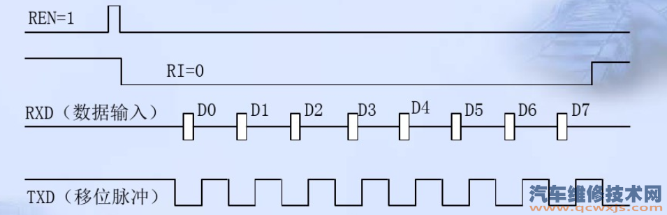當串行口定義為方式0并置位REN后,便啟動串行口以方式0接收數據,此時RXD端為數據輸入端,TXD端為同步脈沖信號輸出端。接收器以振蕩率的十二分之一的波特率接收RXD端輸入的數據信息 7a686964616fe59b9ee7ad9431333332396234。但接收器接收到8位數據時,置1中斷標志RI。
