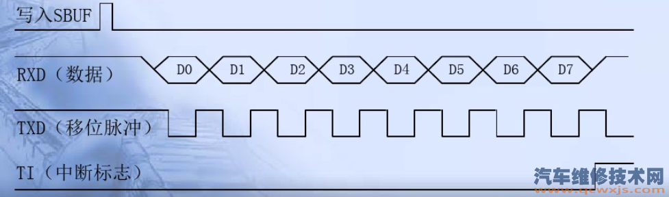 器SBUF的指令(例如,MOV SBUF,A),數據字節寫入SBUF后,便啟動串行口發送器發送,發送完一幀信息,置1放送中斷標志TI。