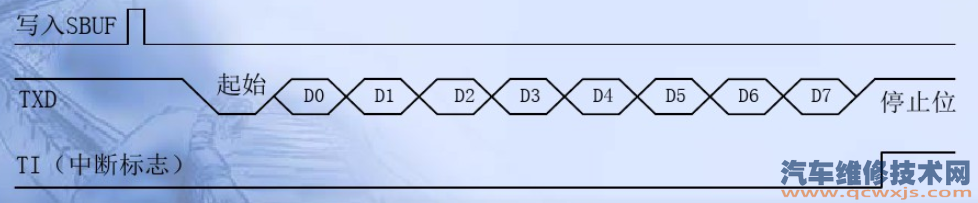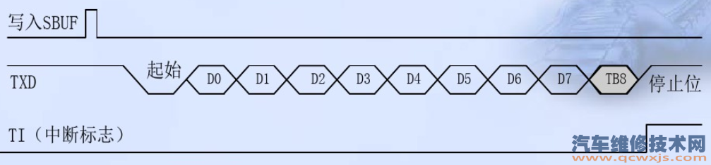 方式2或方式3發送時,數據由TXD端輸出,發出一幀信息為11位,附加的第9位數據是SCON中的TB8,CPU執行一條數據寫入發送緩沖器SBUF的指令,就啟動發送器發送,發送完一幀信息,置“1”TI中斷標志。