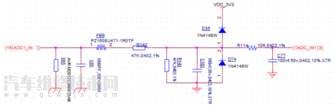 在一些ADC檢測電路中會用兩個二極管進行鉗位保護,原理很簡單,0.7V為D1和D2的導(dǎo)通壓降,Vin進來的電壓大于等于3.3V+0.7V時,D35導(dǎo)通,Vout會被鉗位在4V;Vin小于等于-0.7V時,Vout被鉗位在-0.7V左右。