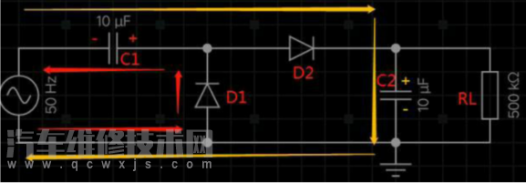 下圖是一個2倍壓電路原理圖,其工作過程大概分析如下: