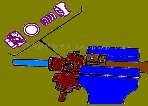 (5)松開轉向器側面鎖緊螺母,然后將調整螺塞、壓力密封墊擋板、彈簧及壓力密封墊依次拆下,