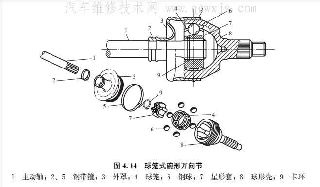 球籠式萬向節按其內、外滾道結構的不同又可分為球籠式碗形萬向節、球籠式雙補償 萬向節和球籠伸縮萬向節等。