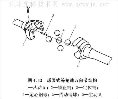 球叉式萬向節的結構如圖4 .12所示,由主動叉6、從動叉1、4個傳動鋼球5和定心 鋼球4組成。其主動叉6與從動叉1分別與內、外半軸制成一體。在主、從動叉上各有4 個曲面凹槽,裝合后,形成兩條相交的環形槽,作為傳動鋼球5的滾道,4個傳動鋼球5 裝于槽中,定心鋼球4放在兩叉中心的凹槽內,以定中心。
