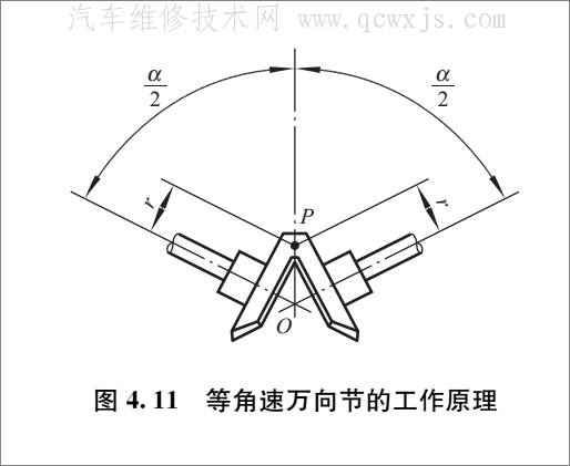 等速萬向節保證萬向節在工作過程中,其傳力點永遠位于兩軸交點的平分面上,如圖4 . 11所示的是等速萬向節的工作原理圖。