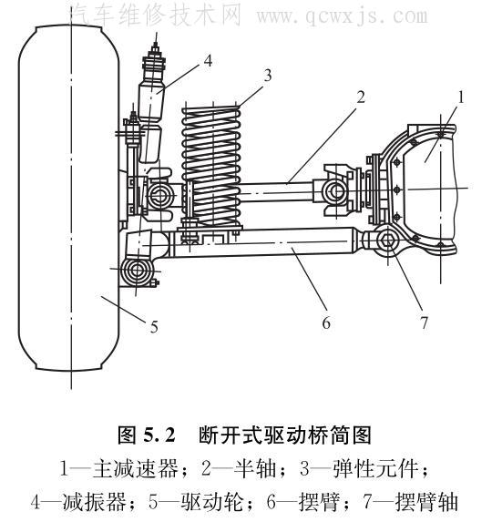 1-主減速器;2-半軸;3-彈性元件;4-減振器;5-車輪;6-擺臂;7-擺臂軸