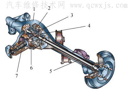 1-后橋殼;2-差速器殼;3-差速器行星齒輪;4-差速器半軸齒輪;5-半軸; 6-主減速器從動(dòng)齒輪齒圈;7-主減速器主動(dòng)小齒輪