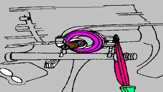 拆卸變速器。拆下分離軸承,如圖2-18所示。用潤滑脂潤滑接觸點,裝上新的軸承,裝上回位彈簧,如圖2-19所示。