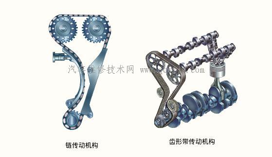鏈傳動機(jī)構(gòu) 用于中置式和上置式凸輪軸的傳動,尤其是上置式凸輪軸的高速汽油機(jī)采用鏈傳動機(jī)構(gòu) 的很多。鏈條一般為滾子鏈,工作時應(yīng)保持一定的張緊度,不使其產(chǎn)生振動和噪聲。為此在鏈傳動機(jī)構(gòu) 中裝有導(dǎo)鏈板并在鏈條的松邊裝置張緊器。