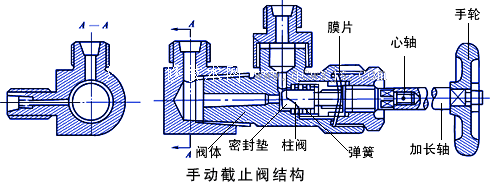 在截止閥閥體內(nèi)裝有柱閥,柱閥左端面嵌有密封墊,彈簧的預(yù)壓力作用在柱閥的右端,保持柱閥常開,CNG從氣瓶經(jīng)柱閥流出截止閥。當(dāng)轉(zhuǎn)動手輪時,心軸向左壓迫膜片并推動柱閥左移壓在閥座上,使截止閥關(guān)閉。膜片由薄鋼片或黃銅片制造,其作用是防止CNG通過心軸向外泄漏。在心軸上接一個加長軸,目的是為了把手輪裝入駕駛室,以便駕駛?cè)四茉隈{駛室內(nèi)操縱截止閥的開閉。