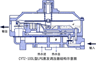 這是一個二級減壓裝置,它與CYTZ-100型CNG減壓調節器的二級減壓和三級減壓部分的結構相同,零部件可以互換,工作原理 也相同,只是參數調整不同而已。在蒸發調壓器的一級底蓋的下方設有水套,發動機 的冷卻液循環其中,對LPG加熱,以使其蒸發氣化。