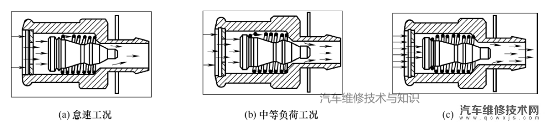 圖(a)表示發動機怠速時,進氣管內真空度最大,閥芯被吸壓靠向閥座,因此曲軸箱中的竄氣只能通過閥的縫隙或小孔通過,流量較小,保持怠速穩定;