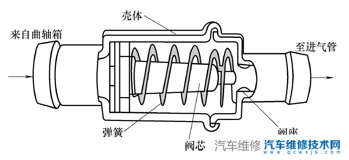 流量控制閥還有止回功能,一旦發動機出現“回火”現象,閥芯即被反向關閉,防止曲軸箱內的廢氣被點燃發生爆炸。