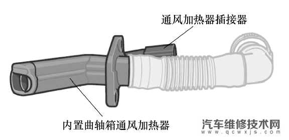 發動機處在冷機狀態運行時,從曲軸箱來的低溫機油蒸氣可能會在通風管路及節氣門閥板和內壁上凝結、沉積并固化,這可能導致通風系統出現堵塞現象,也會造成節氣門閥板發生輕微粘連現象,為此有的汽車在曲軸箱通風管路上設置了加熱電阻,一來加熱裝置對通過的機油蒸氣進行加熱(下圖),避免了機油蒸氣的凝結,再者加熱裝置也可防止通風裝置在吸入很冷空氣時竄氣結冰,堵塞通風管路,可防止曲軸箱出現正壓并延緩節氣門臟污的過程。