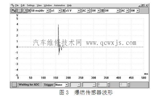 當發動機出現輕微微爆燃時,其動力性能、經濟性接近最佳值。如圖3和圖4,我們不妨來觀察下爆燃傳感器和點火波形。根據之前我們得出的結論,我們知道想要達到最佳點火,點火提前曲線盡可能與爆震曲線相近是非常重要的,理想的高壓點火點應當剛好在鋸齒波發生之前。