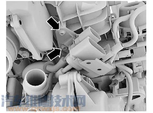 7脫開冷卻液軟管固定夾;斷開增壓壓力傳感器插接器;拆下圖中所示箭頭處的兩顆固定螺栓;將空氣軟管上的固定夾松開,然后向下將空氣軟管從節氣門上拔下。