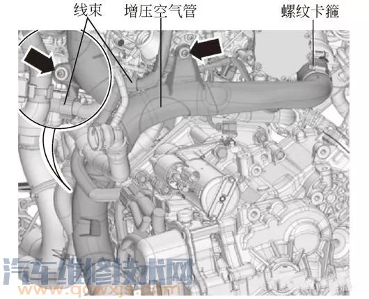 12將線束從固定卡上松開,然后置于一側;松開圖中所示的螺紋卡箍,拆下箭頭處的緊固螺栓,然后取下增壓空氣管。
