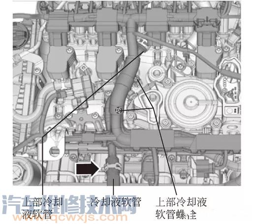 ② 用直徑不超過25mm 的軟管夾夾緊冷卻液軟管,松開圖中箭頭所指的彈簧卡箍,拔出冷卻液軟管;擰出上部冷卻液管的兩顆螺栓,將上部冷卻液管向上抬起。