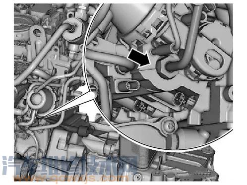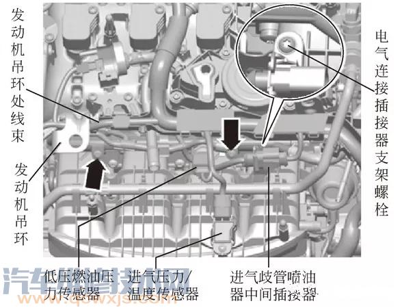 ③ 分別拆下低壓燃油壓力傳感器、進氣管傳感器、進氣歧管噴油器中間的插接器以及發動機吊環處的電線束,擰出圖中箭頭所示燃油分配器螺栓,擰出圖中圓圈放大圖處所示的電氣連接插頭支架上的螺栓,小心地向上拔出燃油分配器和噴油器。