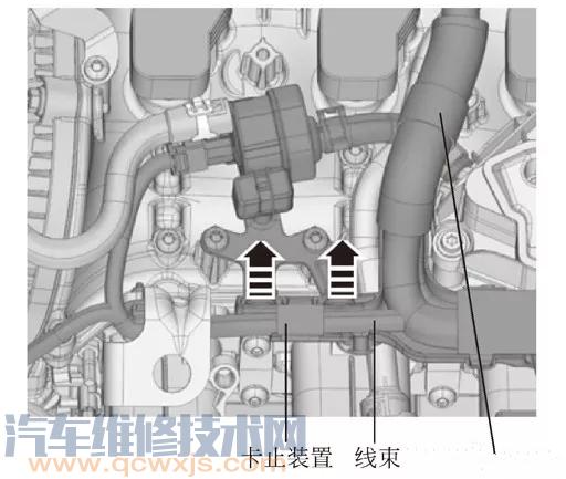 ① 沿箭頭方向松開卡止裝置,將線束從支架上拔出,打開圖中所示的固定夾,脫開線束。