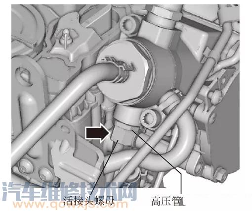 ② 用扳手固定住高壓管連接件,然后拆下箭頭所示的活接頭螺母,從高壓油泵處斷開高壓管連接。