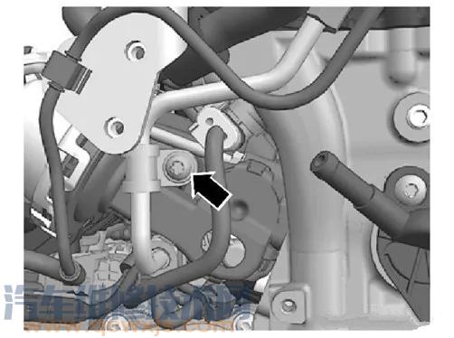 ① 拆下圖中箭頭所示的高壓管固定夾緊固螺栓。