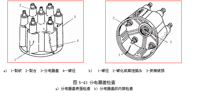 分電器蓋常用的檢查方法有外觀檢查和高壓電檢查兩種方法。直觀檢查時可將分電器蓋從分電器上拆下,并用一塊干燥的棉紗布擦凈。目測檢查分電器蓋是否有裂紋和碳徑,若有應予以更換。檢查分電器蓋內的炭精是否磨損過短、彈簧是否折斷。如圖5-43所示。