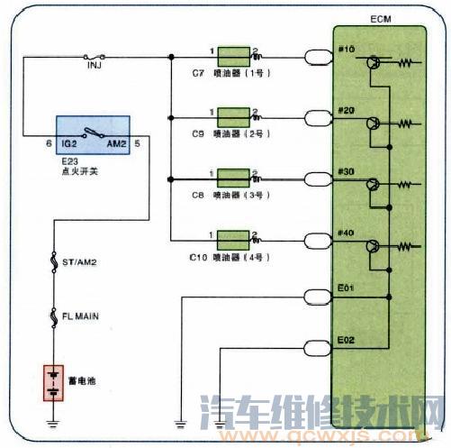如下圖是4缸發動機噴油器的控制電路,各噴油器的1號端子共同接IG2供電,電路如下:IG2點火開關供電→INJ保險絲→各缸的1號端子,各缸的2端子(負極)分別受ECM(發動機電腦)的10#、20#、30#、40#控制,當ECM發出電脈沖給噴油器的線圈(接通2號端子),噴油器開始工作,當ECM發出的脈沖停止的時候,噴油器噴油。