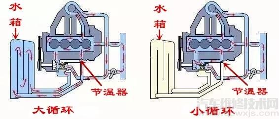 節溫器的作用是隨發動機負荷和水溫的大小而自動改變冷卻液的流量和循環路線,保證發動機在適宜的溫度下工作。當節溫器關閉時,冷卻水不流經散熱器,其水流路線短,散熱強度小,稱為水冷卻系的小循環,此時發動機可以快速升溫;當節溫器開啟時,冷卻水流經散熱器,其水流路線長,散熱強度大,稱水冷卻系的大循環,此時發動機溫度上升較慢。如果節溫器發生了故障,始終處于開啟狀態或過早開啟,冷卻系統始終處于大循環或早早就開啟大循環,發動機溫度就很不容易升高,出現發動機過冷的故障。