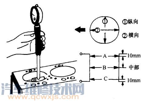 ②如圖,將校對后的量缸表活動測桿在平行于曲軸軸線方向和與之垂直的方向兩方位,沿氣缸軸線方向上、中、下取三個位置(截面),共測六個數值。上面一個位置一般定在活塞在上止點時,位于第一道活塞環氣缸壁處,約距氣缸上端15mm。