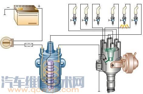 點火線圈的作用是產生高壓電。點火線圈主要是通過初級線圈繞組的電流作為磁場儲存。當初級線圈繞組電流突然被切斷(通過功率晶體管斷開電路接地端)時,磁場衰減,使次級線圈繞組產生感應電動勢,該感應電動勢的電壓使得火花塞放電產生火花。