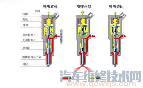 當電磁閥被觸發時,電樞將泄油孔打開,燃油從閥控制室中流到上方的空腔中,從空腔通過回油管道返回油箱,使控制室壓力降低;控制室壓力降低,減少了作用在控制柱塞上的力,這時噴嘴針閥被打開,噴油器開始噴油。