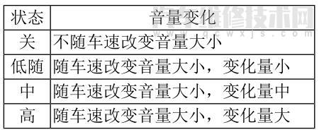 輸出音量隨車速變化自動調節,音隨車速狀態表如下: